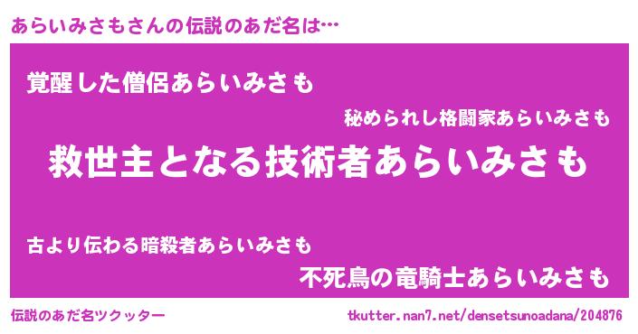 | ヒーロー風カッコイイあだ名 | 『究極戦士アライミサモ』『幻影騎士アラ』 |