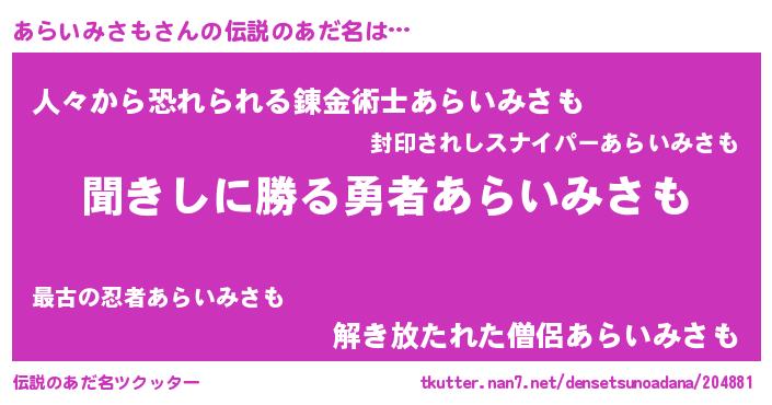 | 意味不明あだ名 | 『住所不定無職あらいみさも(85歳)』 |