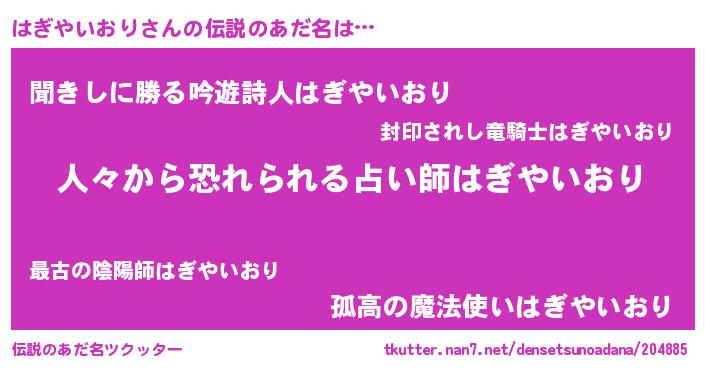 | 男性向けラノベタイトル風あだ名 | 『おまえをオタクにしてやるから、俺をはぎやいおりにしてくれ! 』 |