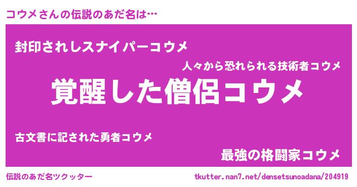 | 男性向けラノベタイトル風あだ名 | 『コウメの嫁は女の子じゃないと思った?』 |