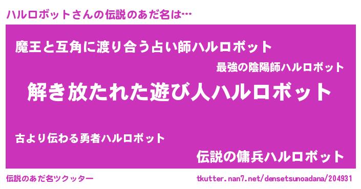 | 男性向けラノベタイトル風あだ名 | 『ハルロボットの嫁は女の子じゃないと思った?』 |