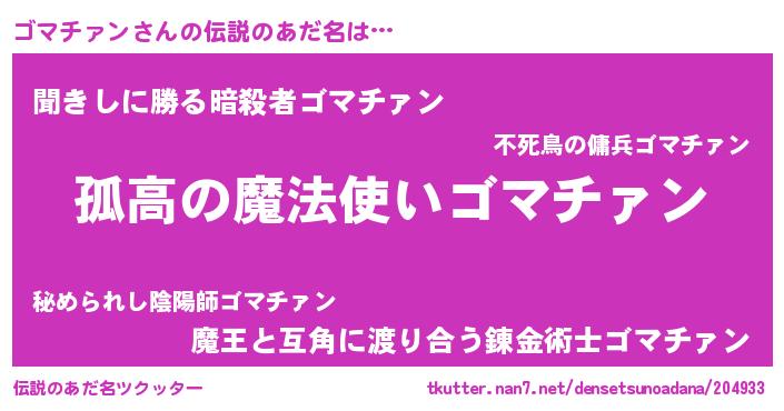 | 男性向けラノベタイトル風あだ名 | 『ダンジョンにゴマチァンを求めるのは間違っているだろうか』 |