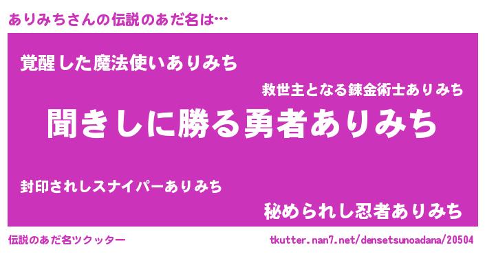 | ヒーロー風カッコイイあだ名 | 『超時空戦士アリミチ』『仮面アリダー』 |