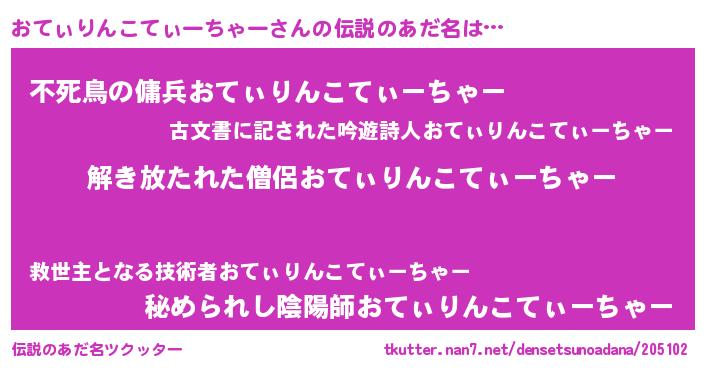 | 女子向けラノベタイトル風あだ名 | 『おてぃりんこてぃーちゃーアンティーク』 |