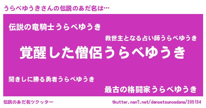 | 男性向けラノベタイトル風あだ名 | 『うらべゆうき~年齢イコール彼女いない歴の魔法使い~』 |