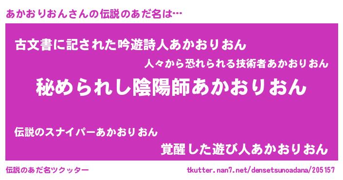 | 男性向けラノベタイトル風あだ名 | 『やはりあかおりおんの青春ラブコメはまちがっている 』 |
