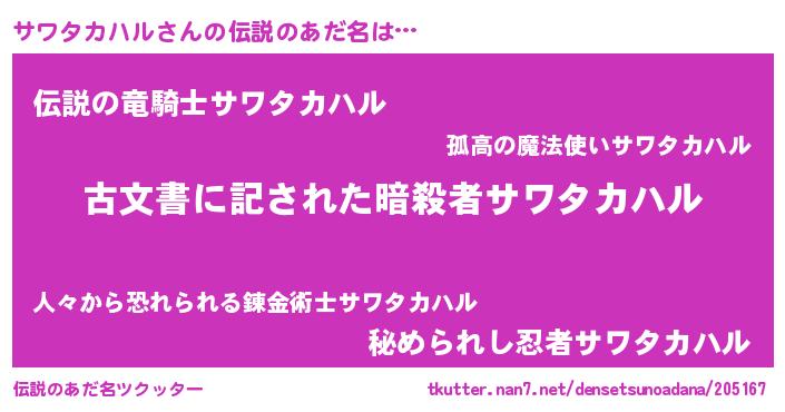 | 意味不明あだ名 | 『永久保存サワタカハル』 |