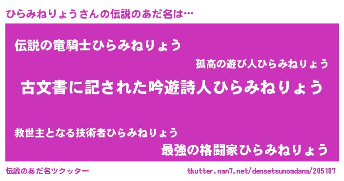 | 男性向けラノベタイトル風あだ名 | 『Re:ひらみねりょうから始める異世界生活』 |