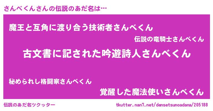 | 意味不明あだ名 | 『永久保存さんべくん』『自称さんべくん』 |