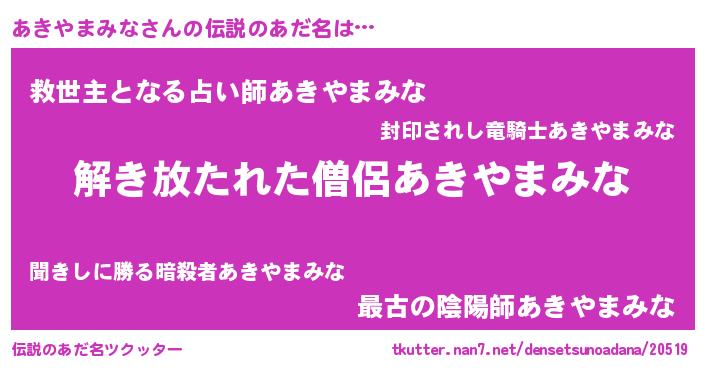 | 意味不明あだ名 | 『とにかく怪しいあきやまみな』 |