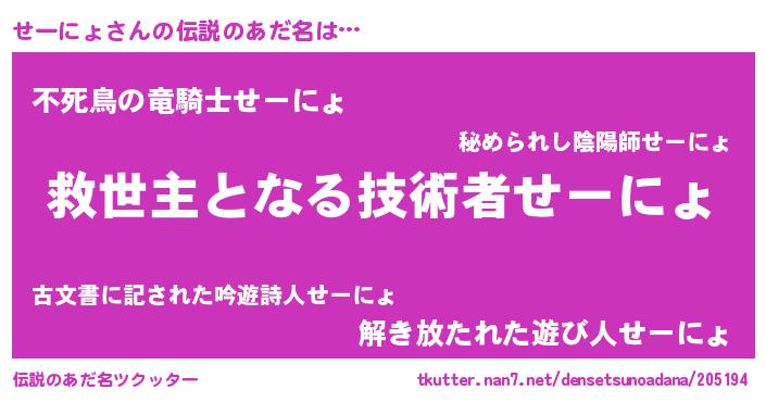 | ヒーロー風カッコイイあだ名 | 『天空の使者せーにょ』『幻影騎士セー』 |