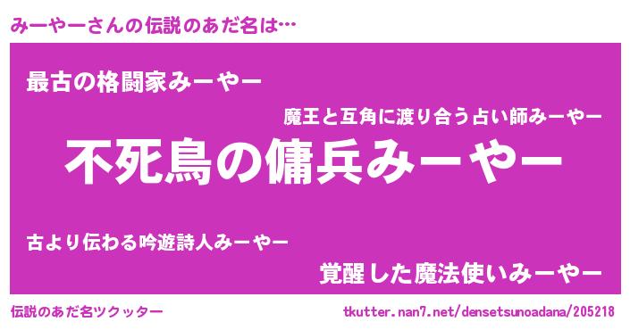 | 胡散臭い通販商品みたいなあだ名 | 『モテモテ間違いなし水晶球…その名も「みーやー」』 |