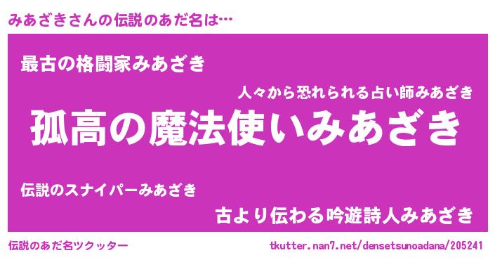 | ヒーロー風カッコイイあだ名 | 『暗黒騎士ミア』『ウルトラみあざきマン』 |