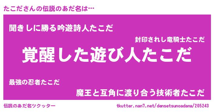 | 男性向けラノベタイトル風あだ名 | 『たこだの嫁は女の子じゃないと思った?』 |