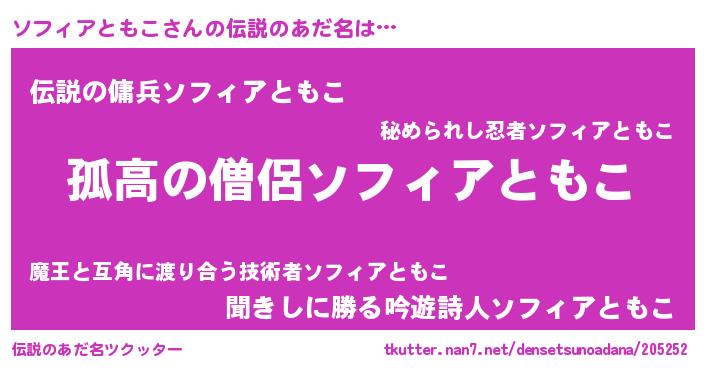| 男性向けラノベタイトル風あだ名 | 『ソフィアトモコスレイヤー』 |