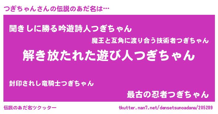 | ヒーロー風カッコイイあだ名 | 『魔戒騎士ツギ』『ネオツギチャン』 |
