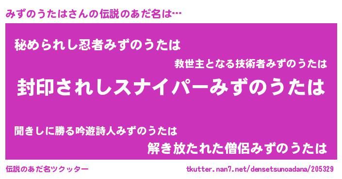 | 男性向けラノベタイトル風あだ名 | 『うちのみずのうたはが世界を掌握している!』 |