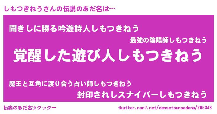 | 意味不明あだ名 | 『住所不定無職しもつきねう(71歳)』 |