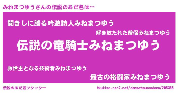 | 男性向けラノベタイトル風あだ名 | 『みねまつゆうの憂鬱』 |