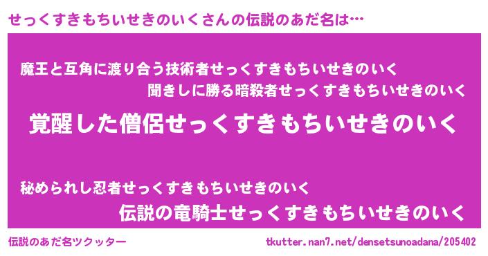 | 意味不明あだ名 | 『とにかく怪しいせっくすきもちいせきのいく』 |