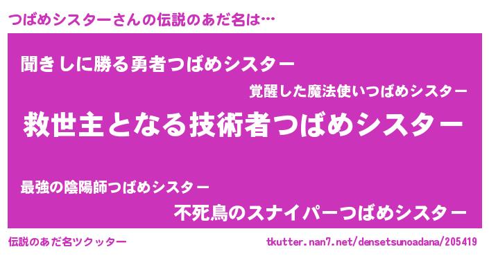 | ヘコむあだ名 | 『つばめシスター(小並感)』『つばもー』 |