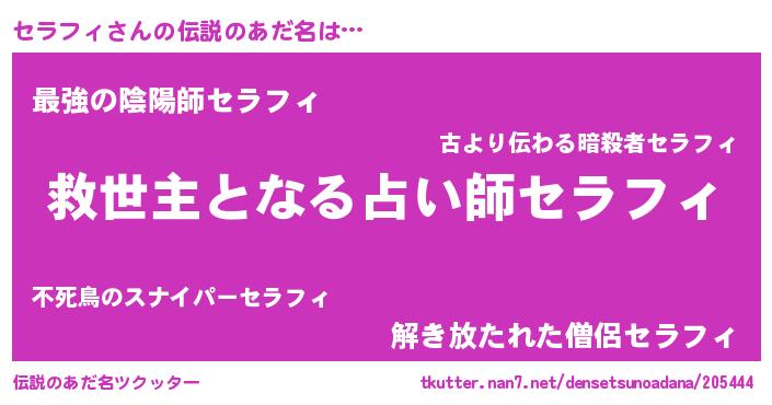 | ヒーロー風カッコイイあだ名 | 『天空の使者セラフィ』『仮面セラダー』 |