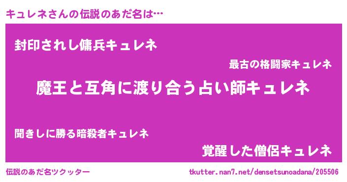 | ヒーロー風カッコイイあだ名 | 『慈愛の使者キュレネ』『炎刃騎士キュ』 |