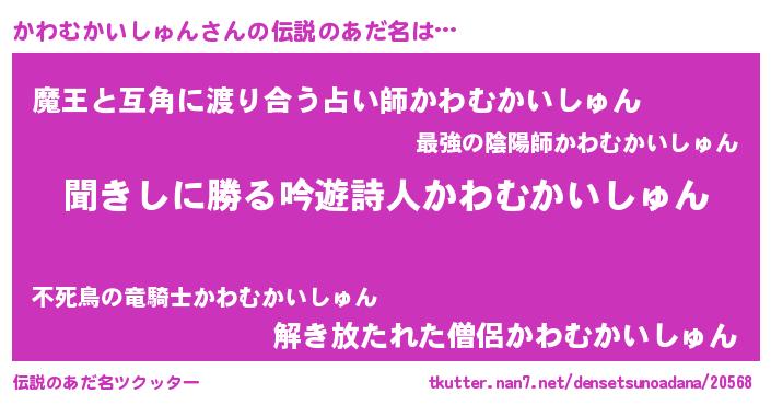 | 意味不明あだ名 | 『住所不定無職かわむかいしゅん(5歳)』 |