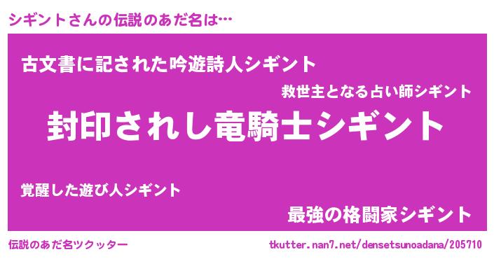 | 男性向けラノベタイトル風あだ名 | 『シギント~年齢イコール彼女いない歴の魔法使い~』 |