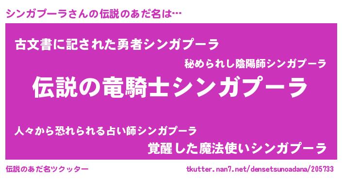 | 男性向けラノベタイトル風あだ名 | 『シンガプーラの憂鬱』 |