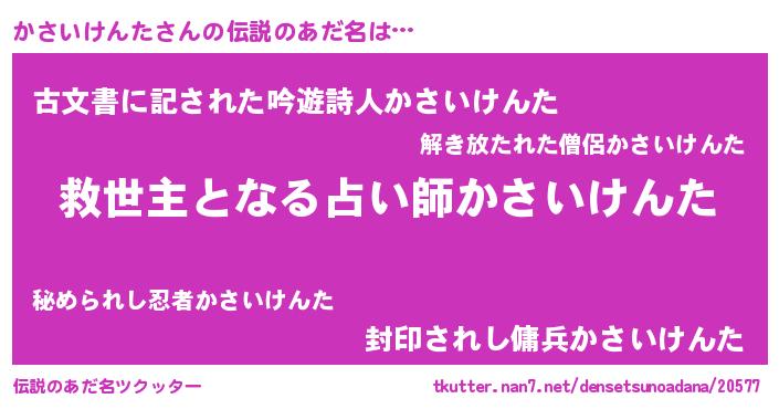 | 男性向けラノベタイトル風あだ名 | 『この素晴らしい世界にかさいけんたを!』 |
