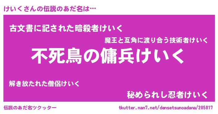 | 女子向けラノベタイトル風あだ名 | 『けいく姫と円卓の騎士』『けいく恋絵巻』 |