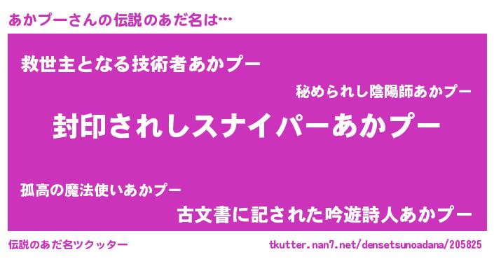 | 男性向けラノベタイトル風あだ名 | 『アカプーアートオンライン』 |