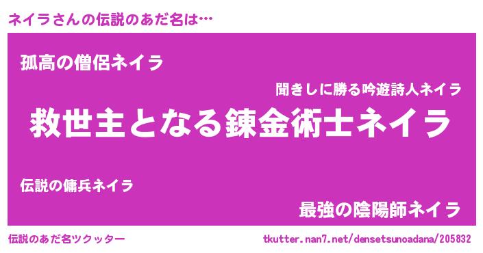 | ヒーロー風カッコイイあだ名 | 『仮面ネイダー』『天空の使者ネイラ』 |