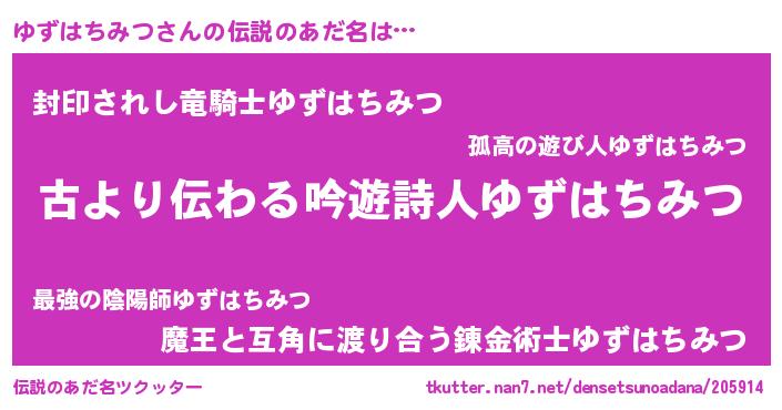| ヒーロー風カッコイイあだ名 | 『ネオユズハチミツ』『魔戒騎士ユズ』 |