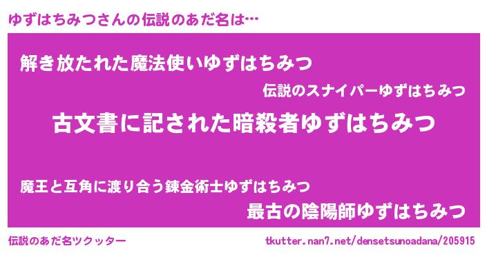 | 男性向けラノベタイトル風あだ名 | 『ゆずはちみつに滅ぼされるだけの簡単なお仕事です』 |