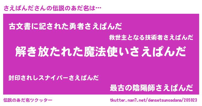 | 意味不明あだ名 | 『自称さえぱんだ』『永久保存さえぱんだ』 |