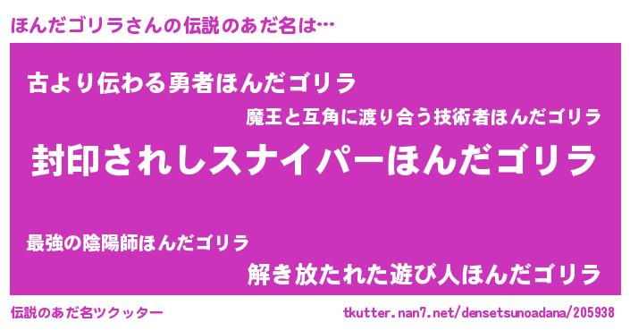 | 男性向けラノベタイトル風あだ名 | 『ホンダゴリラアートオンライン』 |