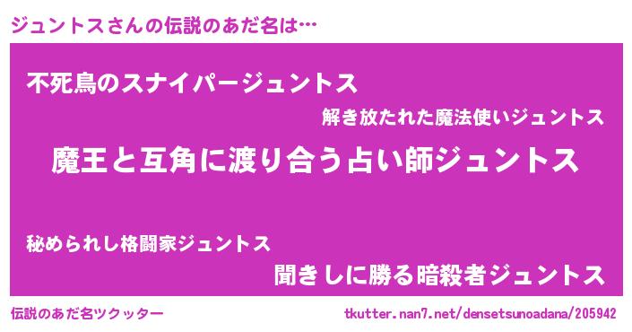 | 男性向けラノベタイトル風あだ名 | 『おまえをオタクにしてやるから、俺をジュントスにしてくれ! 』 |