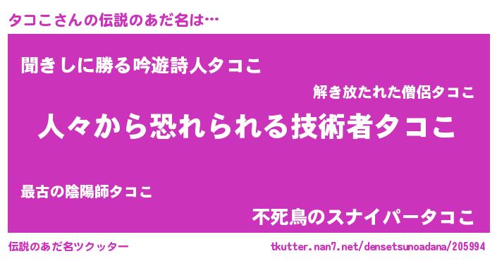 | ヒーロー風カッコイイあだ名 | 『正義の使者タコこ』『ネオタココ』 |