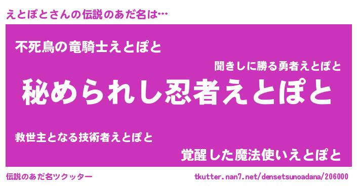 | 意味不明あだ名 | 『自称えとぽと』『えとぽとフォーエバー』 |