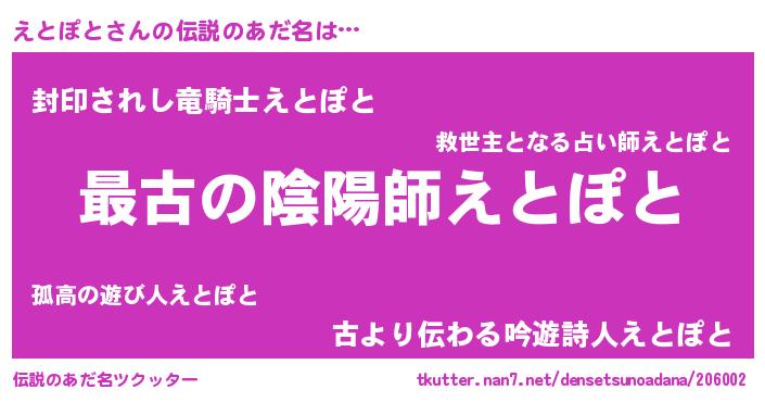 | 男性向けラノベタイトル風あだ名 | 『やはりえとぽとの青春ラブコメはまちがっている 』 |