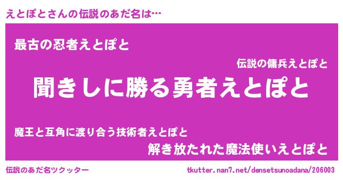| 意味不明あだ名 | 『永久保存えとぽと』『ペロリンえとぽと』 |