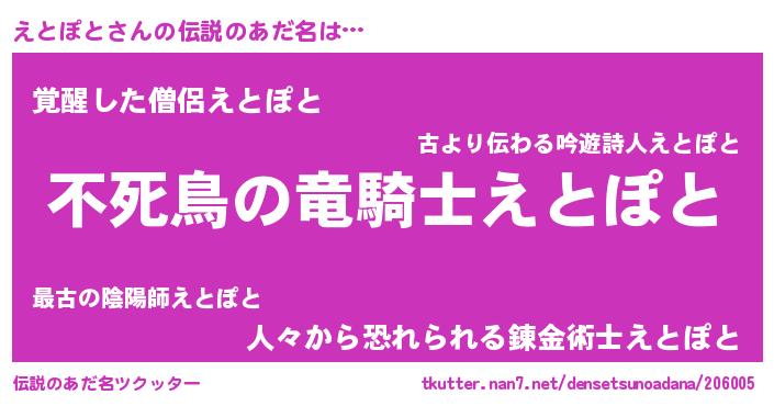 | 男性向けラノベタイトル風あだ名 | 『えとぽとの憂鬱』『魔弾の王とえとぽと』 |