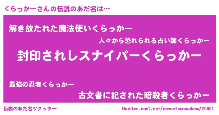 | 胡散臭い通販商品みたいなあだ名 | 『億万長者になれる霊験あらたかなお札…その名も「くらっかー」』 |