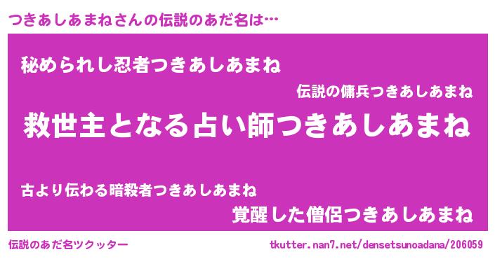 | 男性向けラノベタイトル風あだ名 | 『つきあしあまねに滅ぼされるだけの簡単なお仕事です』 |