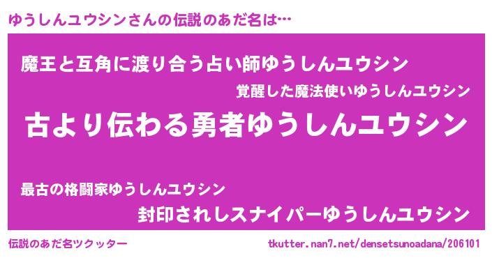 | ヒーロー風カッコイイあだ名 | 『ネオユウシンユウシン』『仮面ユウダー』 |