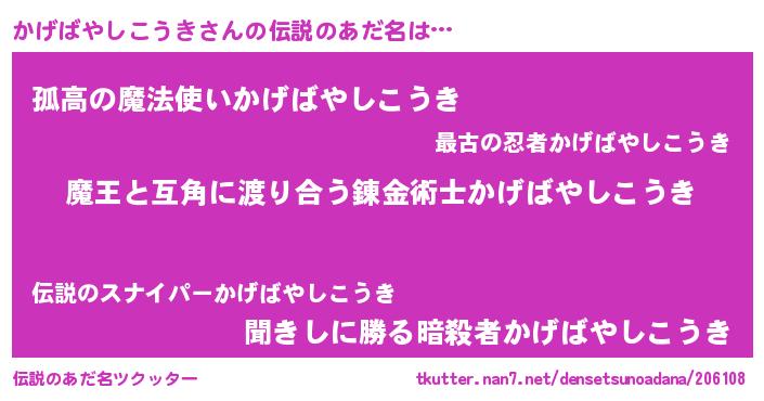 | 男性向けラノベタイトル風あだ名 | 『おまえをオタクにしてやるから、俺をかげばやしこうきにしてくれ! 』 |