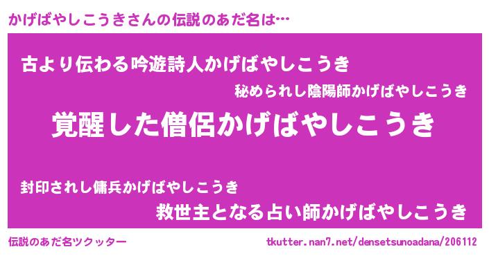 | ヘコむあだ名 | 『かげ太郎』『かげばやしこうき(小並感)』 |