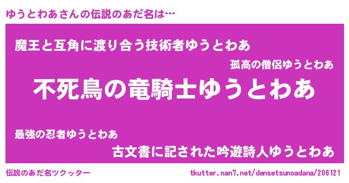 | 女子向けラノベタイトル風あだ名 | 『闇のゆうとわあ』『ゆうとわあ恋絵巻』 |